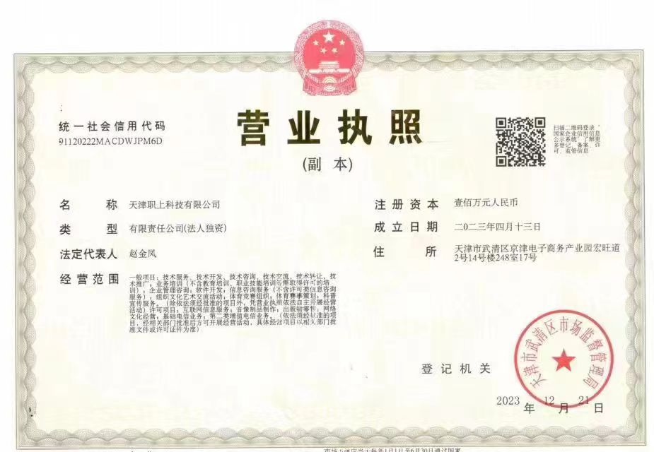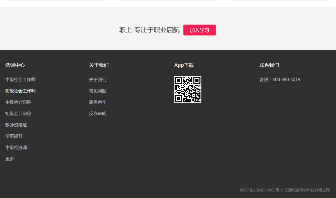 记者另关注到,在“职上网”首页底部的网站备案信息处,显示了“天津职盛尚学科技有限公司”字样,与“职上”App内能查看到的营业执照显示的公司一致;而进入“职上网”的“商务合作”页面,页面底部却标识为“北京职尚教育科技有限公司”。