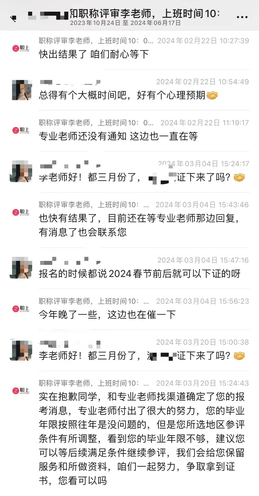 随后,沈先生一边向平台申请退费,一边等待儿子的中级工程师专业职称“下证”。沈先生介绍,他的儿子去年本科毕业,取得了会计师资格证,“职上网”代办老师告知,其儿子符合申报条件,可以办理天津的中级工程师专业职称,预计年末就有评定结果。然而,到今年3月,代办老师却告诉沈先生,其儿子的中级工程师因不符合申报条件没有评下来,并解释“毕业年限按照往年是没问题的,但是所选地区参评条件有所调整”。