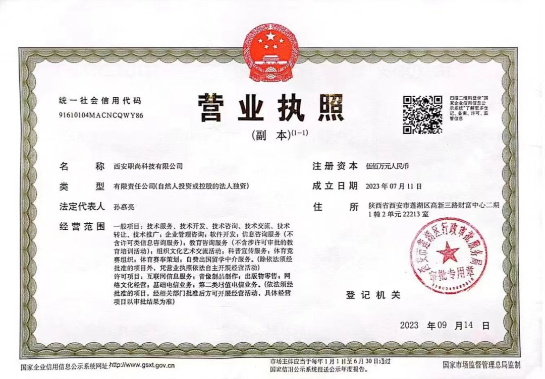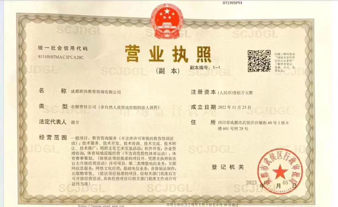 销售人员说:“天津是专门做申报材料这方面,但是我们在西安、成都都有分公司,北京(职尚教育科技有限公司)实际上它之前是天津政府这边被招商引资过去的。一个是项目品牌、一个是公司名字,它们都属于一个公司,都是一家。”