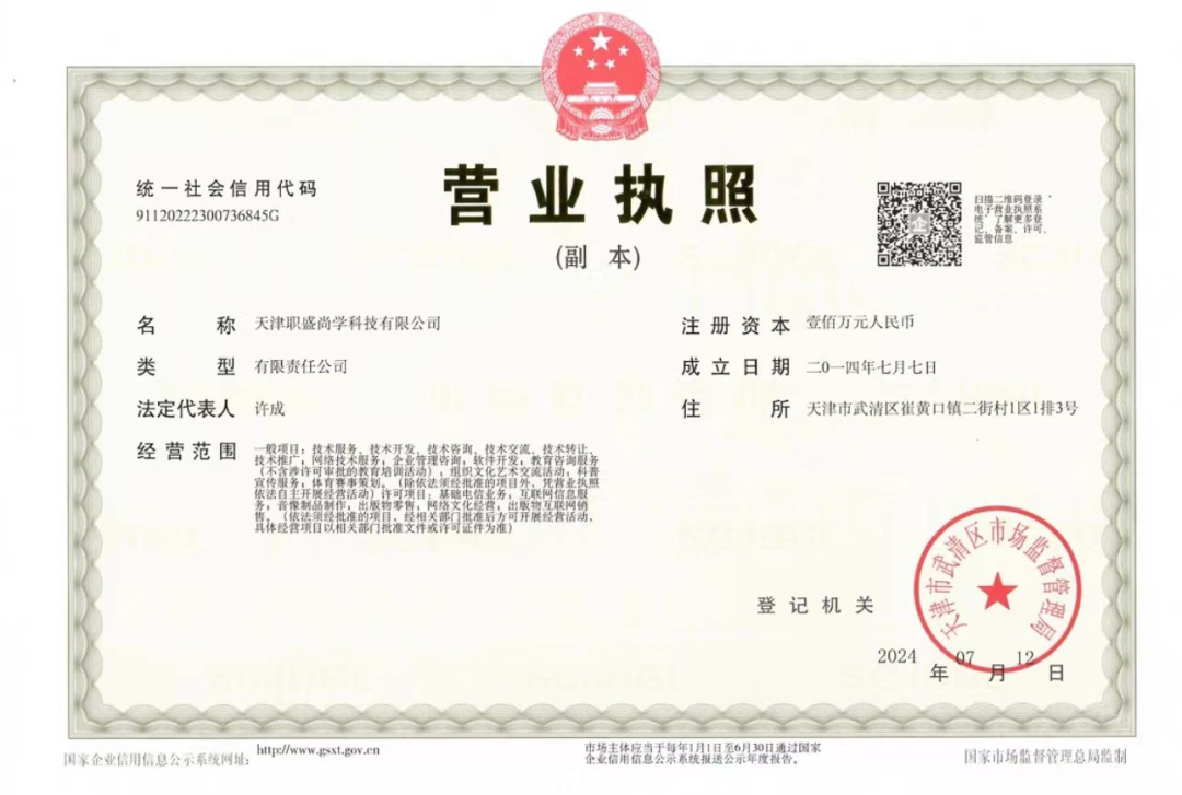 代办老师向其他学员提供的“天津分公司”的营业执照