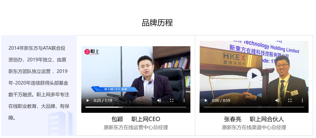 根据“职上网”官网上的一则视频介绍,“职上网”由新东方和ATA共同投资创办、孵化的领先的在线职业教育平台,目前由原新东方团队独立经营。
