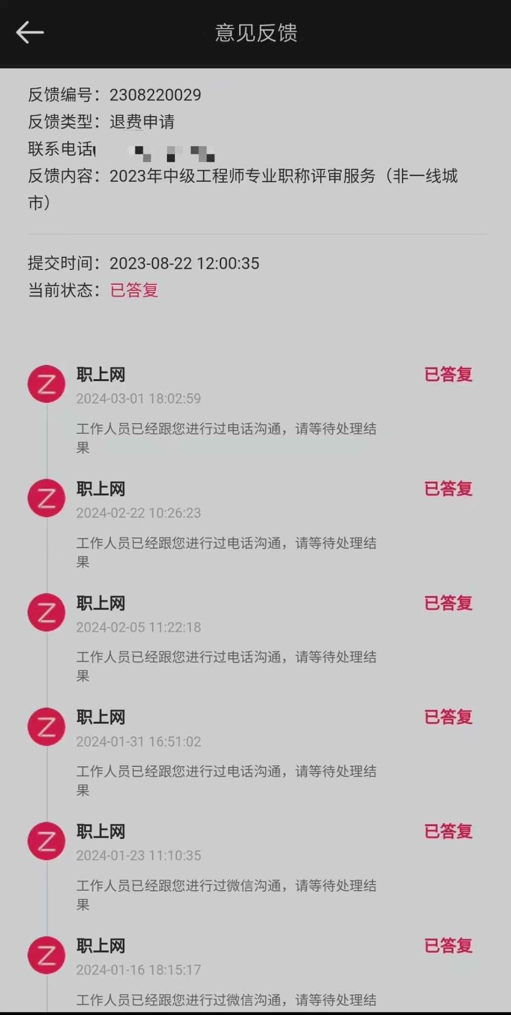 记者查询消费者服务平台“黑猫投诉”发现,涉及“职上网”的投诉多达近3000条;按照关键词“职尚”搜索,平台显示来自各地“职尚教育”诱导消费、不予退款的投诉信息超过5000条。记者以咨询中级工程师职称代办为由,在“职上网”官网提供的公众号留言,随后一位销售人员回电,详细介绍了职称代办的细则。