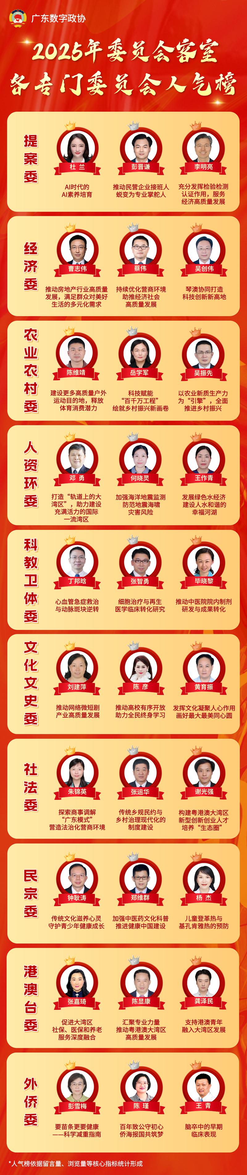 2025年委员会客室人气榜出炉啦!一年里,广东数字政协平台“委员会客室”栏目化身民意“连心桥”,200名省政协委员与近5000名网友“零距离”互动交流,全年会客总浏览量突破48.5万次。哪些会客议题牵动万千网友心弦?哪些委员的建言赢得群众“刷屏点赞”?基于留言量、浏览量等核心数据,我们精心梳理出这份人气榜单,带您一探群众关心关切,见证委员履职实践,解码新时代协商民主的“广东样本”。