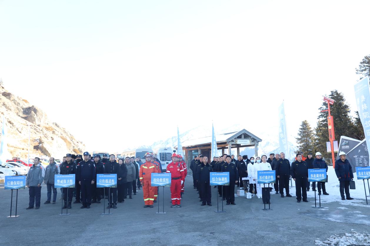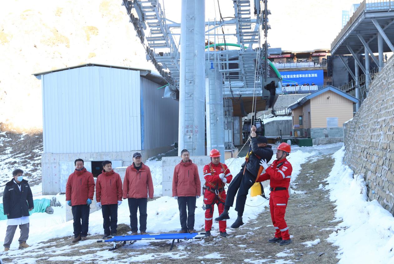 演练实地模拟该景区客运索道突发电气故障,导致7名游客被困高空吊厢、20名游客滞留上下行平台的情况。设置企业先期处置、信息上报、监测与侦察等15个演练科目,组建综合协调、警戒保卫、抢险救援、医疗救护、后勤保障、宣传报道、技术专家、事故调查共8个工作小组。
