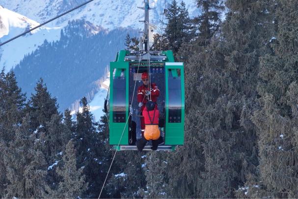救援人员携带设备攀登至索道支架顶部,通过救援小车滑降至吊厢上方,在架设导向绳与救援绳后安全进入吊厢,询问“被困游客”身体状况,并将缓降器固定好,依次将“被困游客”安全转移至地面。整个救援过程紧张有序,“被困游客”成功获救,演练达到预期效果。