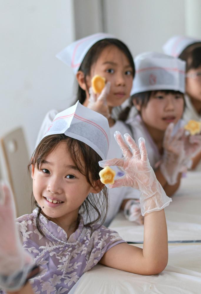 8月26日,在山东省青岛市城阳区河套街道西河套社区,小朋友学做七夕巧果。