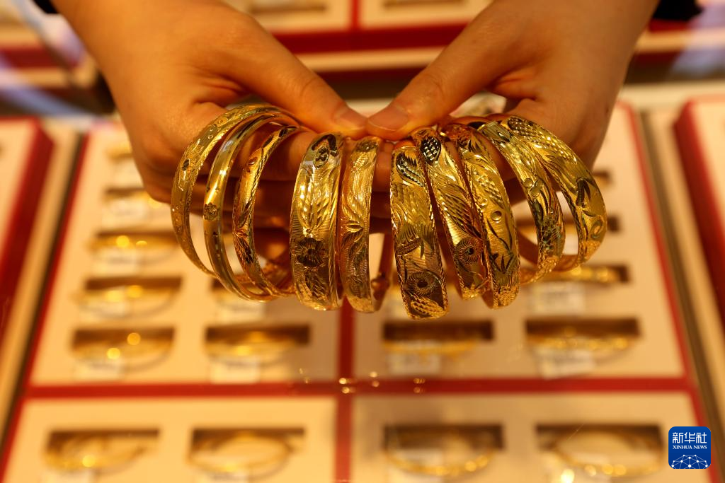 1月26日,江苏省连云港市连云区一家黄金店店员在整理黄金饰品。新华社发(王春 摄)