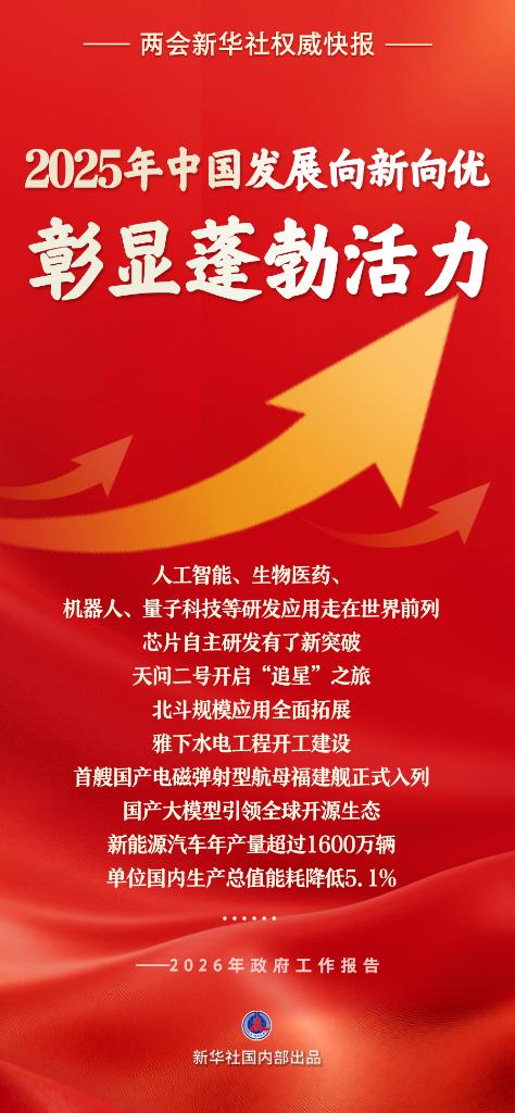 两会新华社快讯:政府工作报告说,一年来,我国发展向新向优、彰显蓬勃活力。新质生产力稳步发展,科技创新成果丰硕,人工智能、生物医药、机器人、量子科技等研发应用走在世界前列,芯片自主研发有了新突破,天问二号开启“追星”之旅,北斗规模应用全面拓展,雅下水电工程开工建设,首艘国产电磁弹射型航母福建舰正式入列,国产大模型引领全球开源生态。产业结构持续优化,高技术制造业、装备制造业增加值分别增长9.4%、9.2%,工业机器人、集成电路产量分别增长28%、10.9%,新能源汽车年产量超过1600万辆,电动汽车充电设施突破2000万个。单位国内生产总值能耗降低5.1%,生态环境质量持续改善。