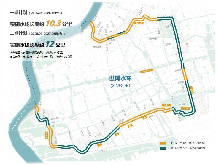世博水环由白莲泾、大寨河、北界河、人民江、三林塘港、小黄浦6条河道构成,全长约22.3公里,涉及周家渡、南码头、花木、东明路和北蔡、康桥、三林七个街镇,辐射约160万人口,与黄浦江衔接成“o”字环形。世博水环一期工程已于今年6月底开工,计划2026年12月建成,实施水线长度约10.3公里;二期工程计划今年9月开工,2027年6月建成,实施水线长度约12公里。
