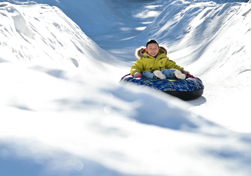 1月10日,一名小朋友在祁连县阿咪东索林海露营基地体验冰雪项目。