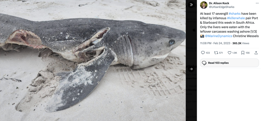 2023年2月,南非国家公园的海洋生物学家艾莉森·科克(Alison Kock)在该国最南端的珍珠海滩上,发现了一起残忍的海洋杀戮案件。受害者是一只宽吻七鳃鲨,它毫无血色的残破尸体被海水冲上灰白色的沙滩上,肝脏区域几乎被完全吃掉了,靠近鱼鳍的区域也被大力撕开。