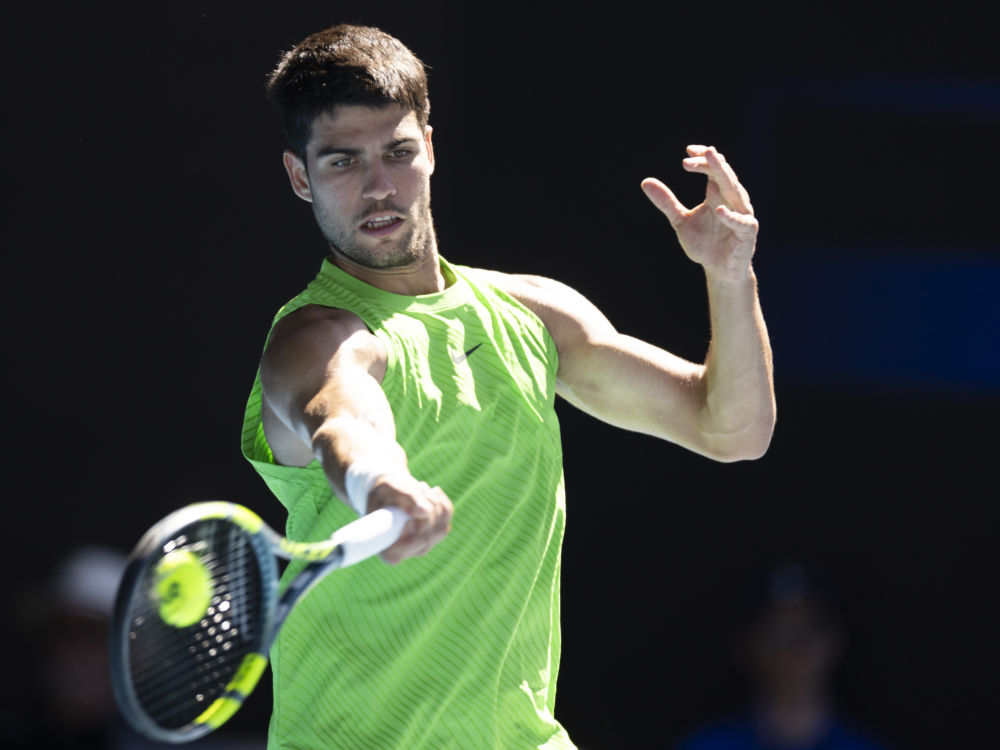 1月23日,阿尔卡拉斯在比赛中回球。新华社发(胡泾辰 摄)