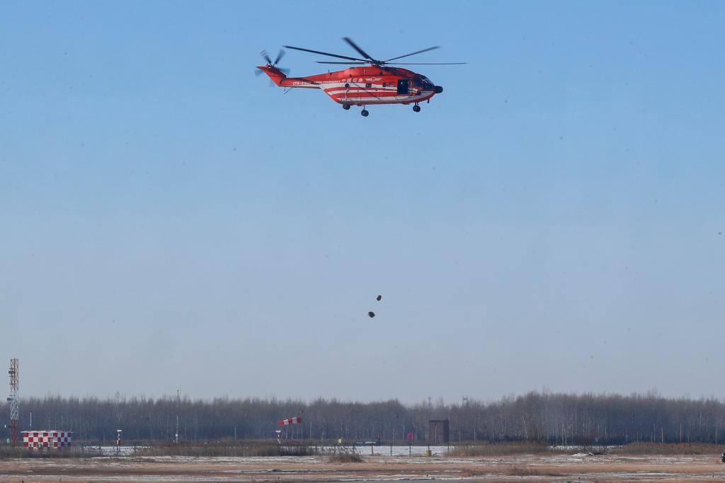 1月29日,在空投实战化训练现场,救援直升机完成精准空投。