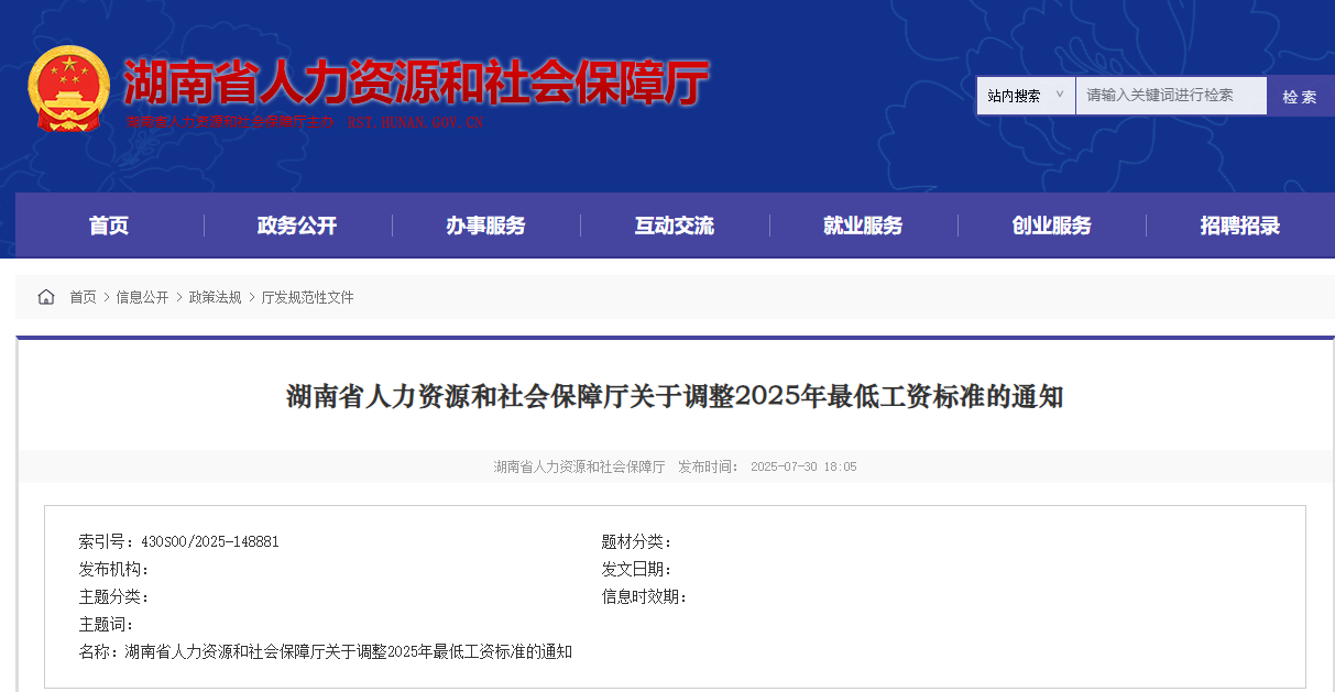 湖南省人社厅于近日印发了《关于调整2025年最低工资标准的通知》,从2025年9月1日起,调整全省最低工资标准。
