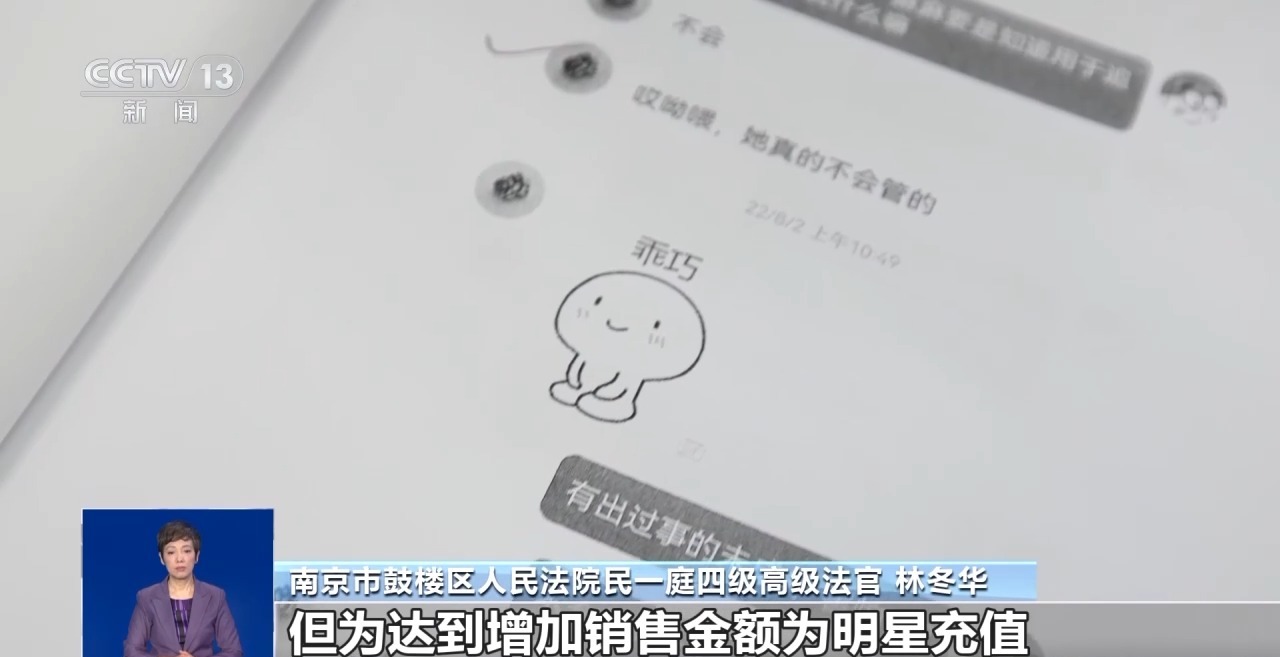 南京市鼓楼区人民法院民一庭四级高级法官 林冬华:根据粉丝群成员的聊天记录,阿伟在出售产品时,其实知晓小童是未成年人,但为达到增加销售金额为明星充值、购买明星竞选活动投票权的目的,以小童在应援会组织的消费抽奖中中奖为由对其进行奖励,主观上有放任小童大额消费的情形。