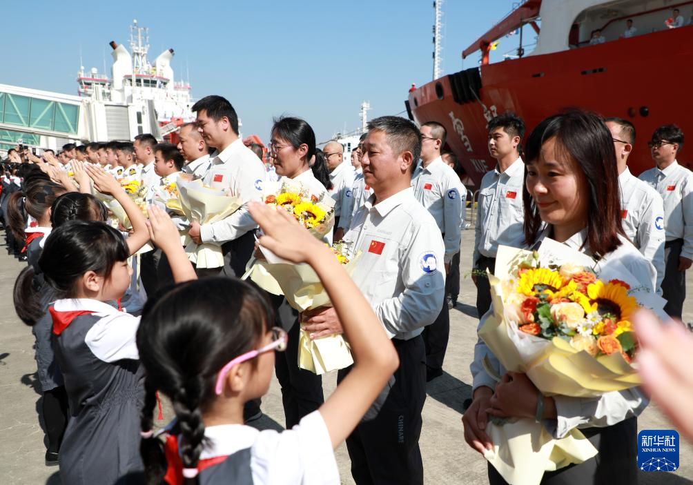 11月1日,少先队员向中国第41次南极科学考察队员献花。