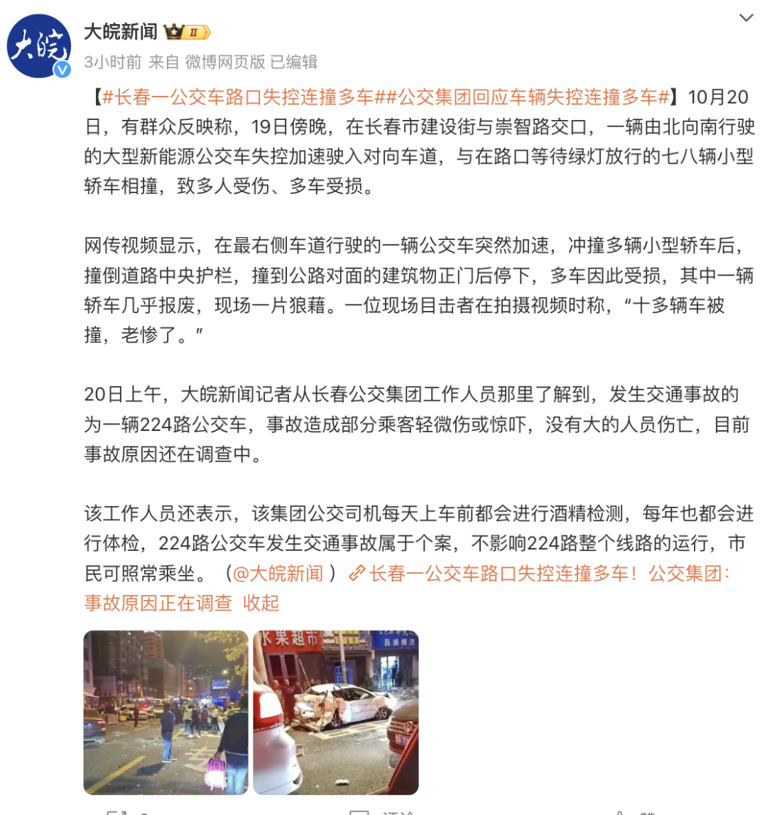 10月20日,长春交警支队发布通报称,2023年10月19日17时30分,长春市公安局情指中心接报:朝阳区崇智路与建设街交汇处一辆224路公交车与多车相撞,有人受伤。