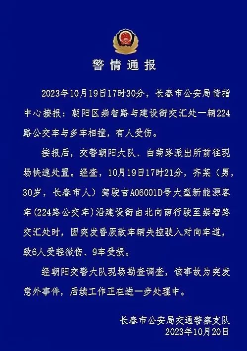 经查,10月19日17时21分,齐某(男,30岁,长春市人)驾驶吉A06001D号大型新能源客车(224路公交车)沿建设衡由北向南行驶至崇智路交汇处时,因突发昏厥致车辆失控驶入对向车道,致6人受轻微伤、9车受损。