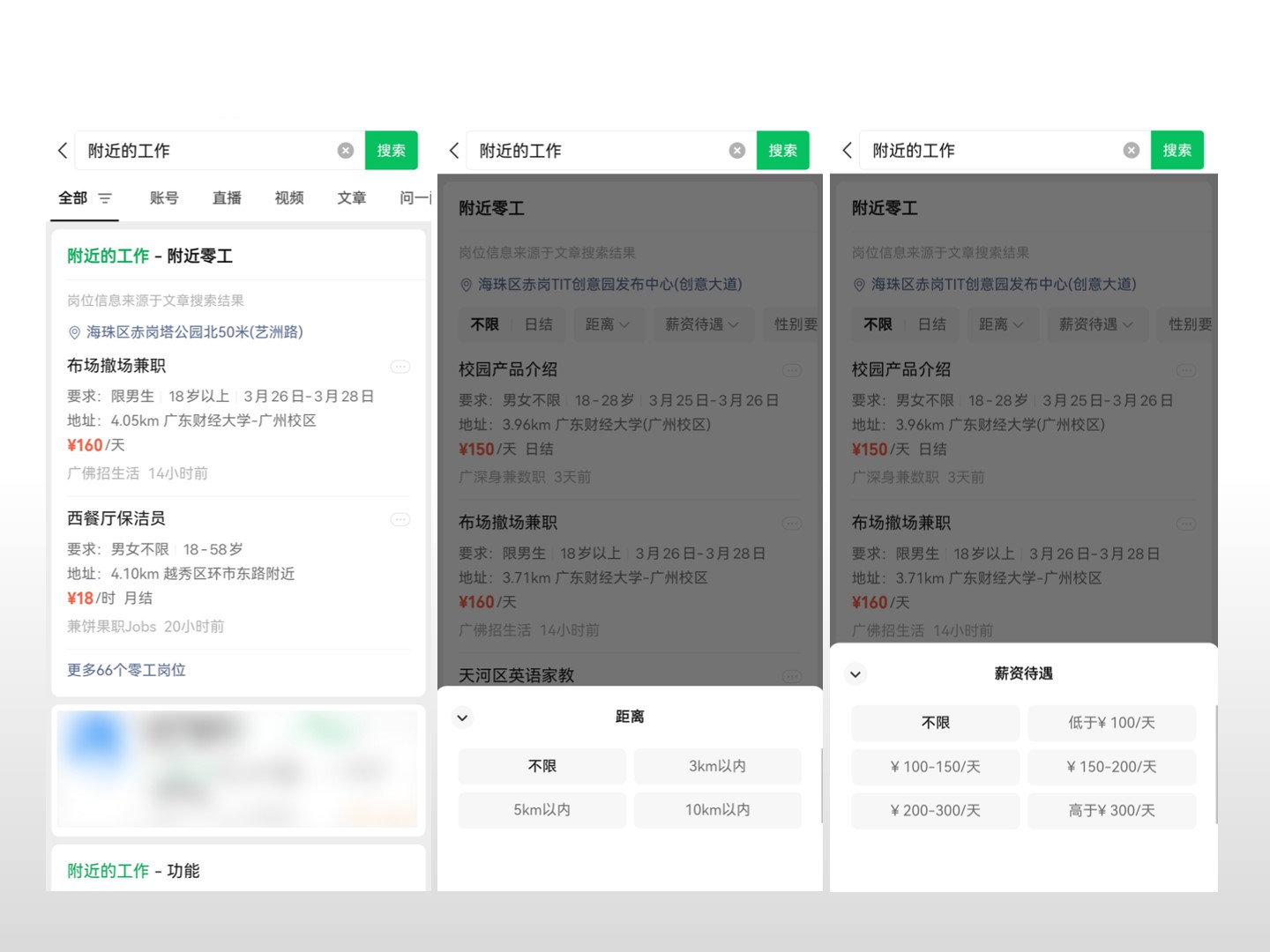 广州某配送员体验该服务后表示,以前找零工会去线下招工市场或关注一些APP和本地公众号、小程序,要找很久,现在微信里搜一下就能看到附近更多机会,还能按薪资和距离排序,特别方便。