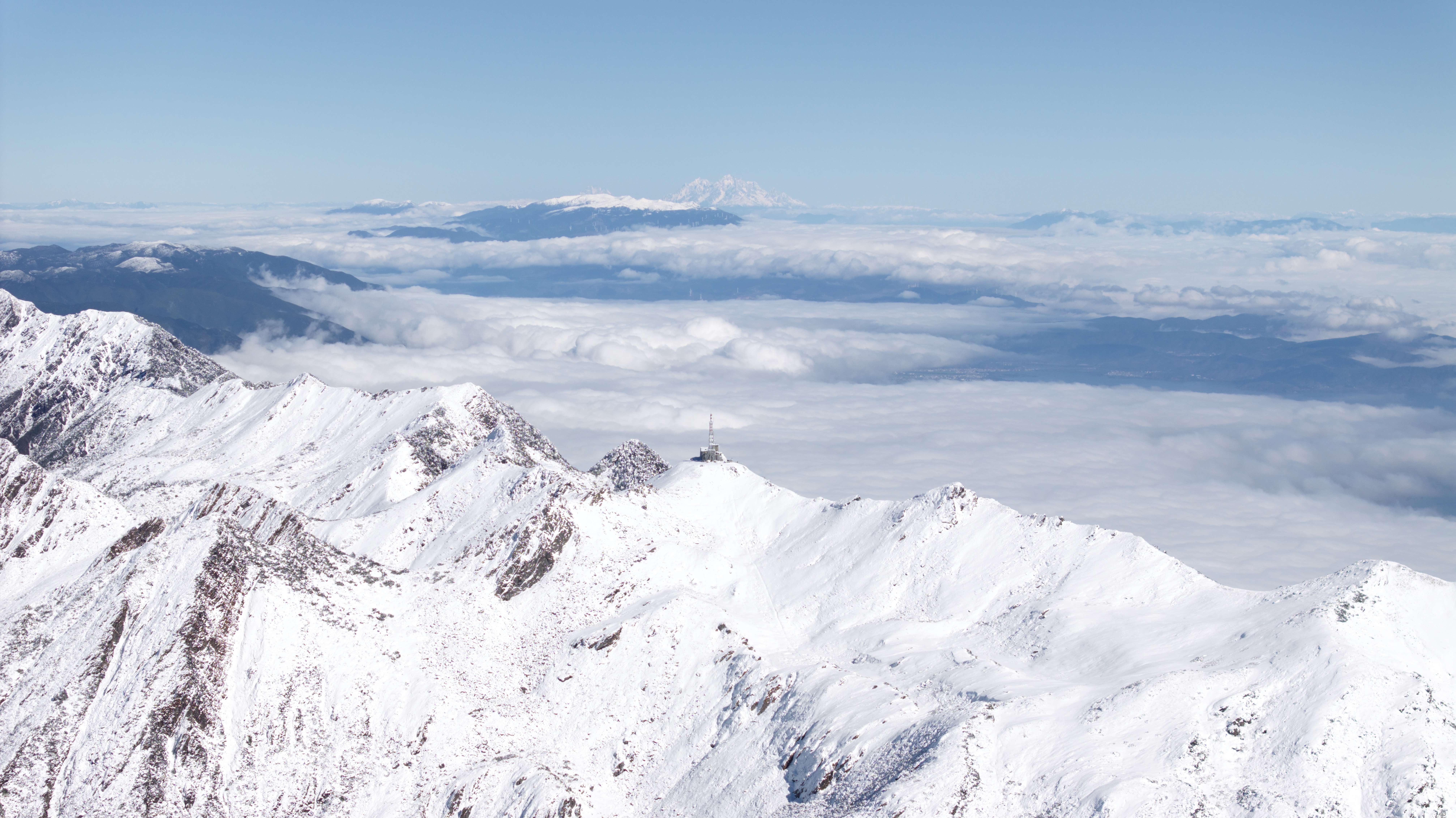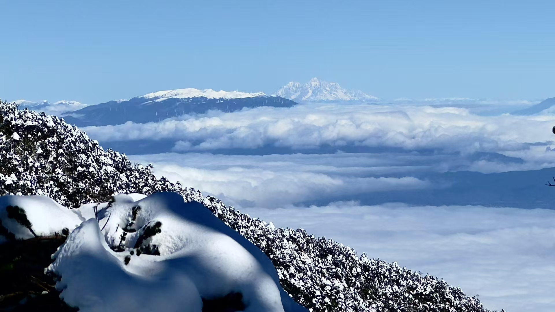 雪山美景。钟铭超 摄更罕见的是,与苍山相距200公里左右的玉龙雪山,也在镜头中清晰可辨,两山雪景遥相呼应,在碧空中完成了一次浪漫“邂逅”。