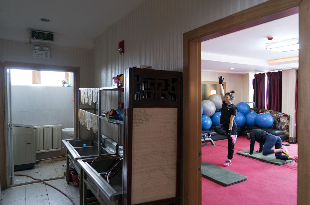 2017年12月4日清晨,徐梦桃(左)和王心迪在杠铃房里热身。新华社记者 费茂华 摄