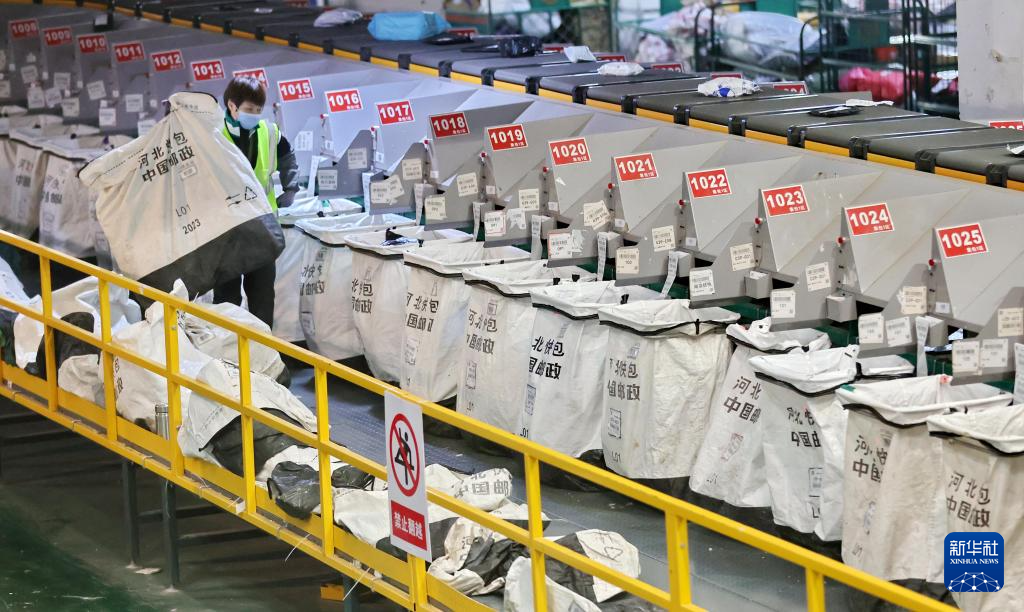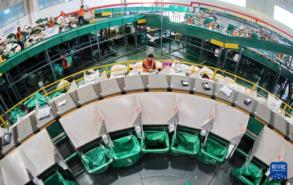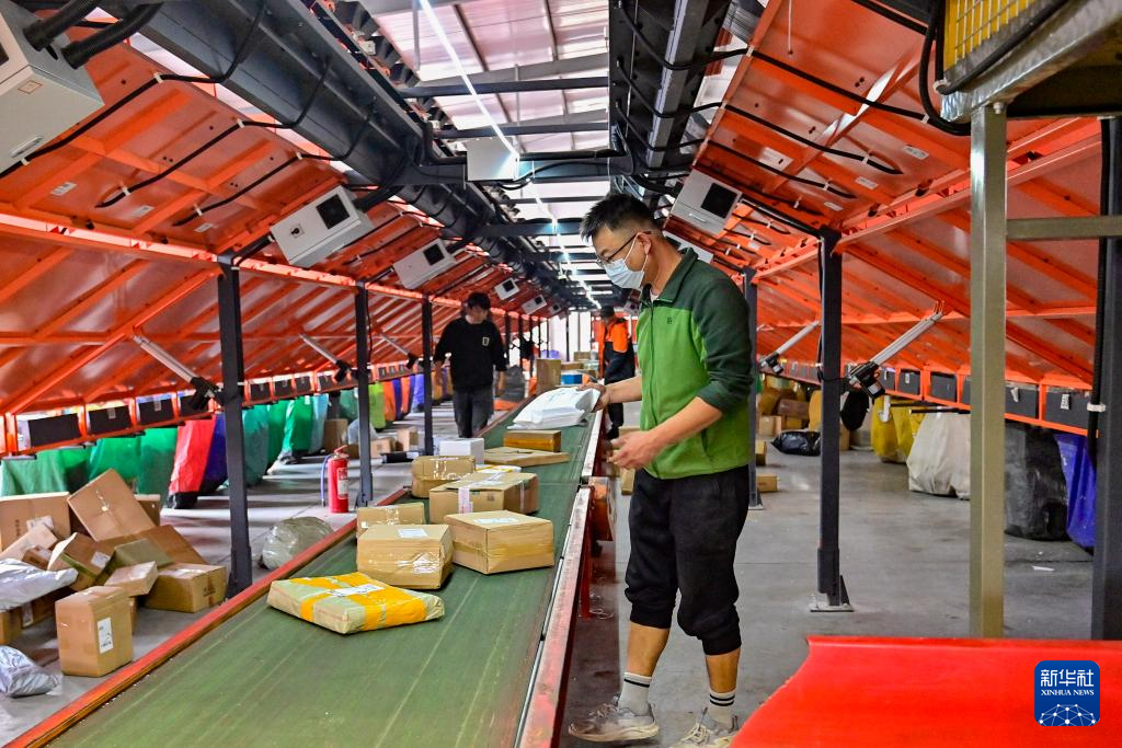 11月12日,位于河北省秦皇岛市海港区东港镇的中国邮政集团有限公司秦皇岛市分公司网路运营中心内,工作人员在分拣快递。