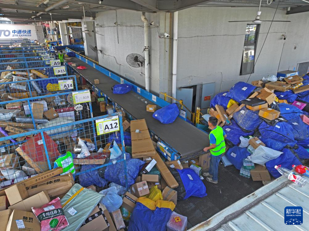 11月13日,工人在位于广西南宁市五象新区的一家快递转运中心装卸包裹(无人机照片)。