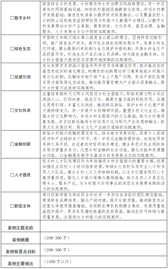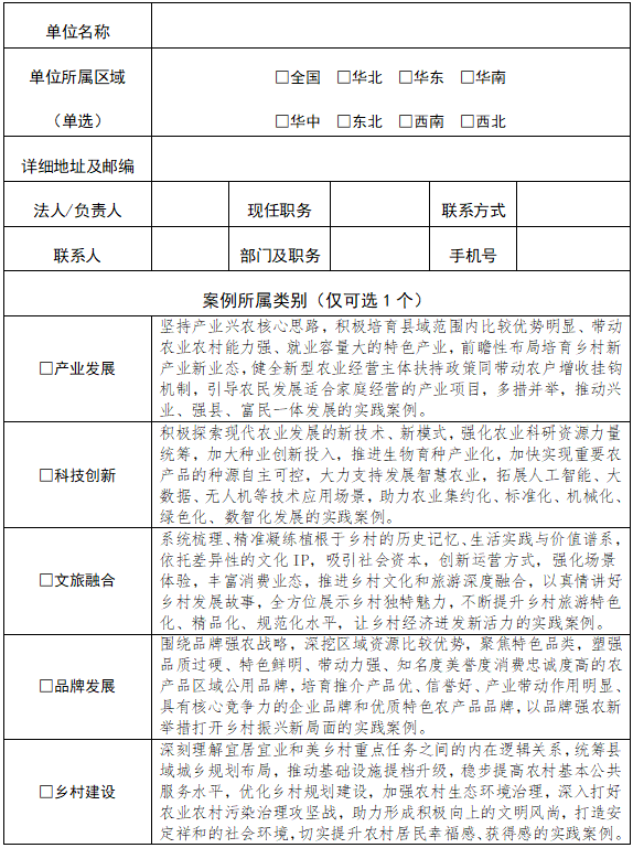 本次活动征集时间为2025年7月22日至11月30日,案例征集方向在原有基础上进一步优化,共囊括12个组别(类别阐释详见附件),包括:产业发展、科技创新、文旅融合、品牌发展、乡村建设、数字乡村、绿色生态、党建引领、文化传承、金融创新、人才提质、新型主体等。各级国家机关、事业单位、国企央企、民营企业、高校科研院所、人民团体和其他社会组织均可自荐、推荐案例,且每个申报主体只能选择一个组别提报案例。