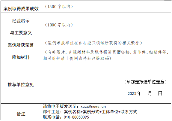 1.案例报送需要认真填写《新华网2025乡村振兴实践案例征集表》,并于2025年11月30日24时前,以真实身份发送至邮箱:xczx@news.cn,投稿文件(邮件)请以“案例名称+案例形式+主体单位+联系方式”的格式命名,有关图片、媒体报道复印件等可作为附件同时发送。投稿无登记表者不予评选。