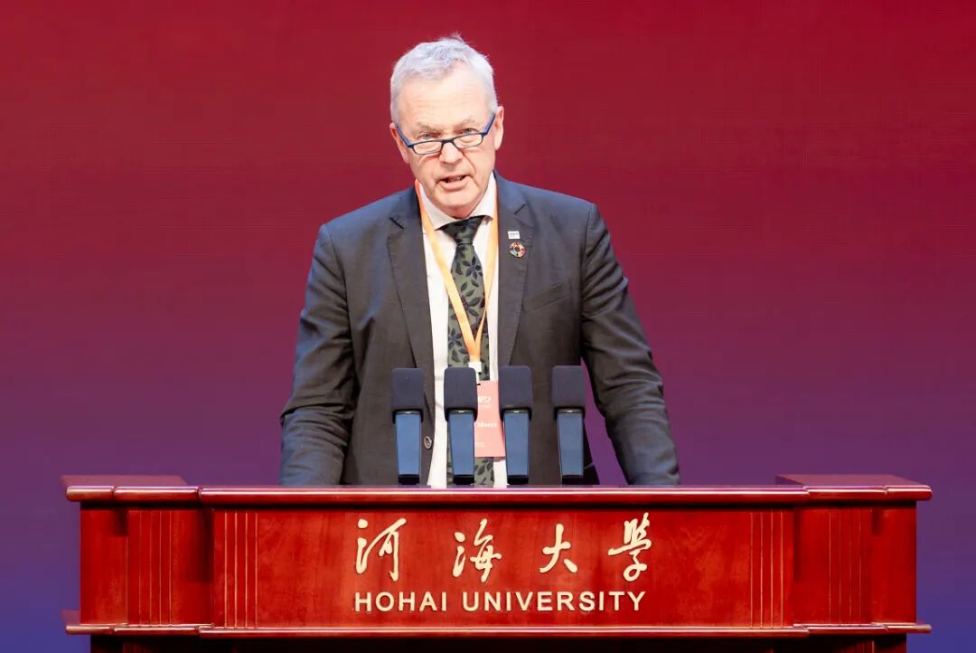 代尔夫特水教育学院校长Eddy•Moors作为国外高校代表致辞。他表示,河海大学作为中国最早专注于水利领域的高等学府之一,为中国江河湖泊与河口三角洲可持续发展作出深远贡献,有力推动全球水科学进步。荷兰与中国同为依水而生的国度,正因都秉持着团结合作精神,河海大学与荷兰高校之间的合作,得以跨越时光、结出硕果。在共庆河海大学百十辉煌成就之际,希望两校携手持续推动水科学创新发展,培育未来水利领域的领军人才,共建一个更具韧性、可持续发展的地球家园。