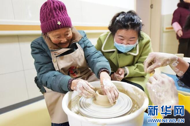 图为医养中心老人体验陶艺制作技艺。新华网发