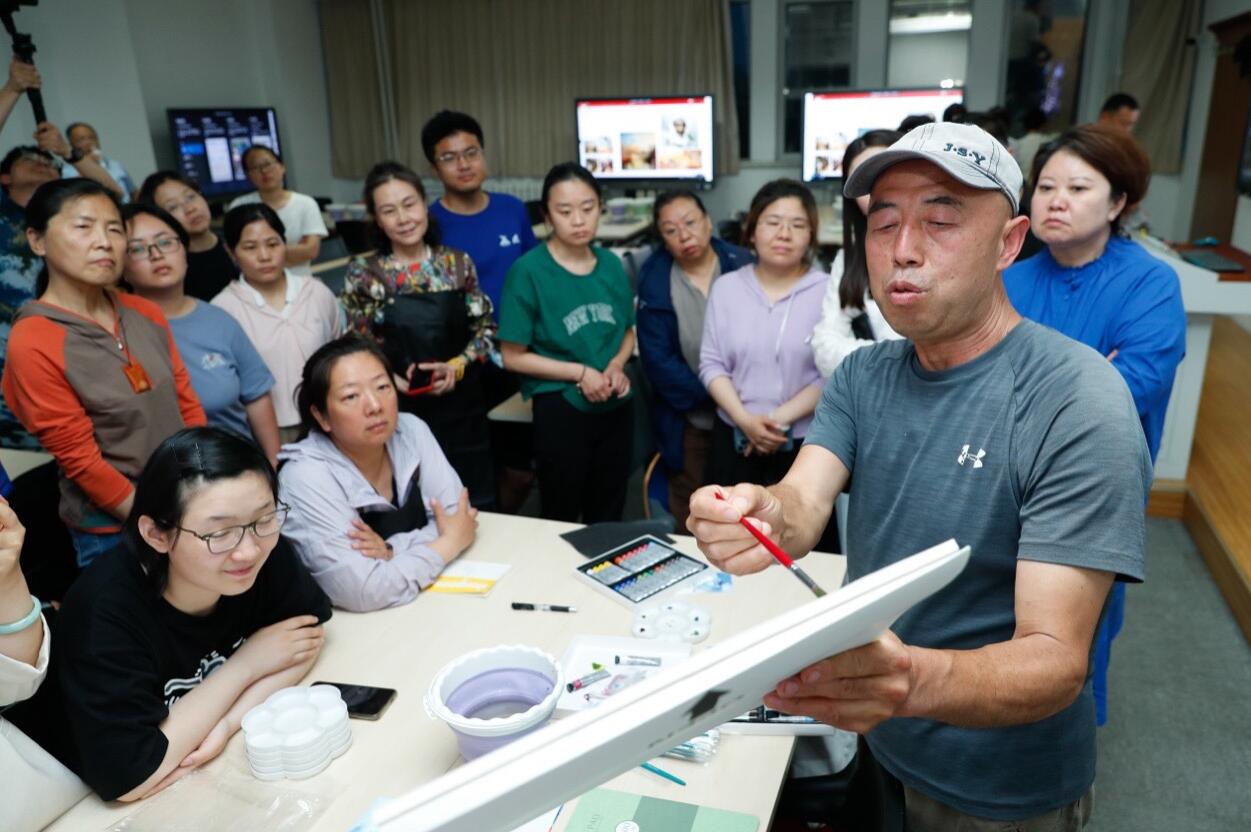 “画水彩画,水一定要足。咱们的画本要有一定的坡度,这样水是慢慢往下晕染的,下面再画的时候,还没干,色彩容易接上……”2024年5月17日晚6点半,在北京联合大学北四环校区综合楼的一间教室里,被十几名“学生”团团围住的校艺术学院教授黄金龙手持绘画本和画笔,一边讲解一边现场演示水彩画的基本知识,并不时回答学生的疑问。这种沉浸式教学正是夜校的特色——摈弃照本宣科,强调“学即能用”。短视频课堂上,教师带领学员走出课堂拍摄校园风景,现场学习运镜等专业手法;沟通课上,心理咨询师创设“家庭剧场”,让家长孩子角色互换体会彼此心境。