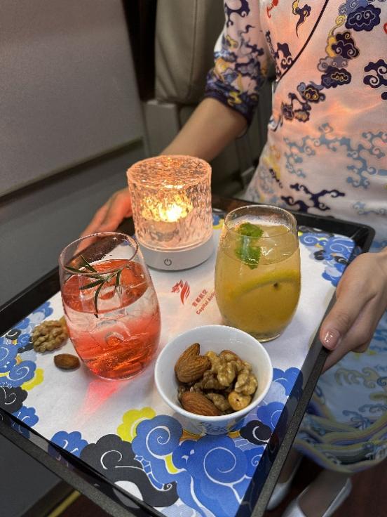 赏味云端,自然少不了“好饮”搭配。首都航空匠心推出“四季茶饮”:春季菊花决明子茶、夏季红豆薏米茶、秋季胖大海雪梨茶、冬季玉米须茶,在不同季节为旅客准备具有多种功效和益处养生茶饮,在享受温润滋养的同时感受养生之道。不仅如此,酸甜可口的水果茶、醇香的特调咖啡以及根据不同航线、不同节日、不同季节不断更新的特调迎宾饮,都让旅客的云端体验更添活力与舒心。