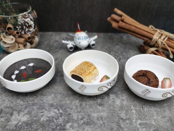 北京出港航班上配备的芝麻糊(左一)等餐品