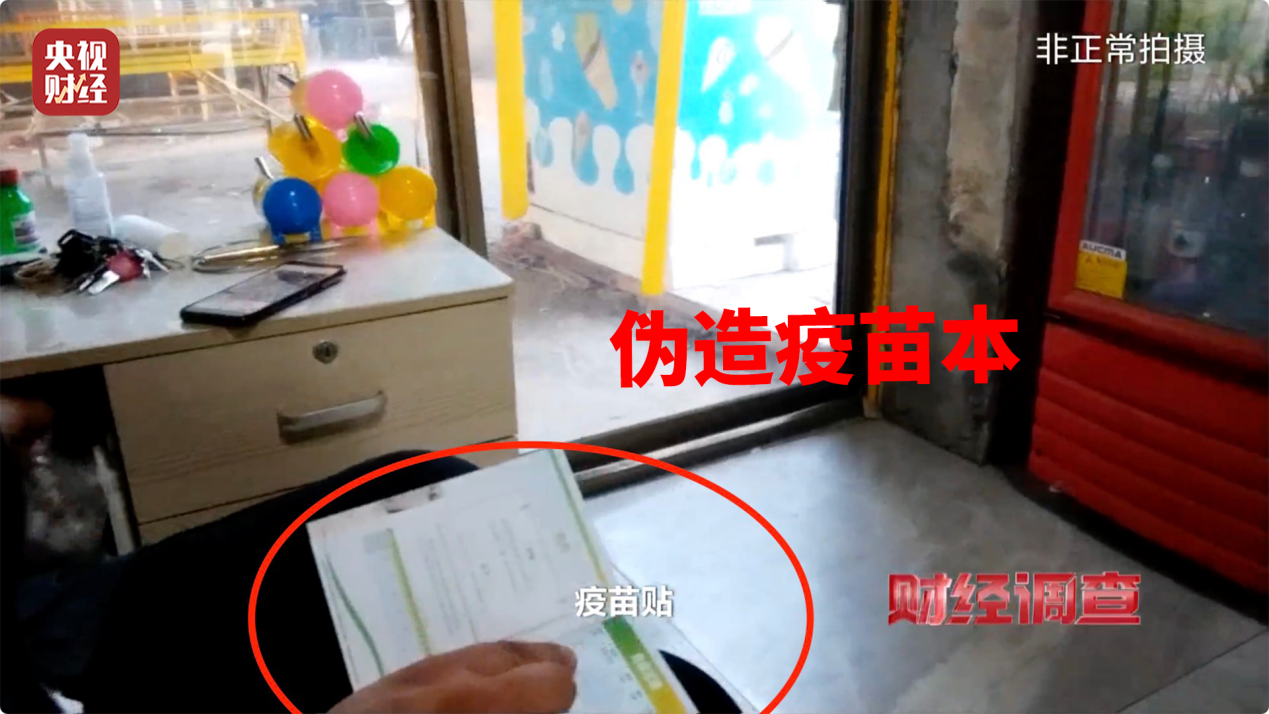 记者来到沛县宠物市场内部的华康宠物医院,在这里,工作人员小心谨慎地从货架底层取出一份空白的疫苗接种记录册,在向记者询问宠物出生日期、性别、品种三项内容后,就写上注射日期,并贴上疫苗贴,签字、盖章后,以单价5元售卖给记者,并向记者强调,不要对外宣称这份疫苗接种记录册子是从他这里购买的。