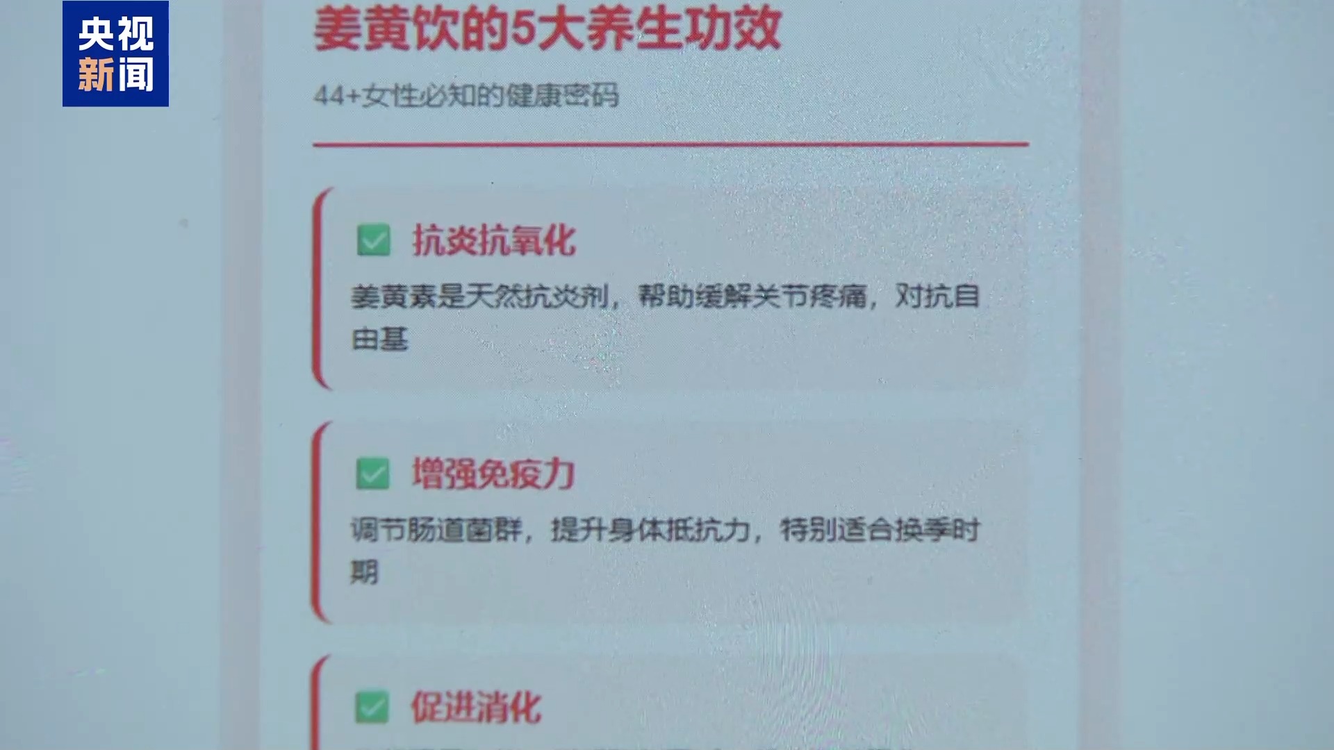 最近,在部分网络直播间和社交媒体平台上,一款名为“姜黄饮”的饮品被频频刷屏。有网络博主称,姜黄饮能“抗炎养生”,不管是工作压力大,还是外卖吃多了肠胃不佳,喝了这杯“黄金液体”就能抗炎、抗氧化、提亮肤色。一款饮品真的有“抗炎养生”神效吗?一起来揭开真相。