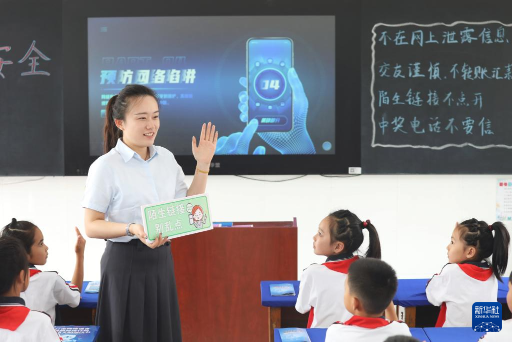 9月15日,河北省唐山市丰润区泉河头小学老师在给学生讲解网络安全知识。