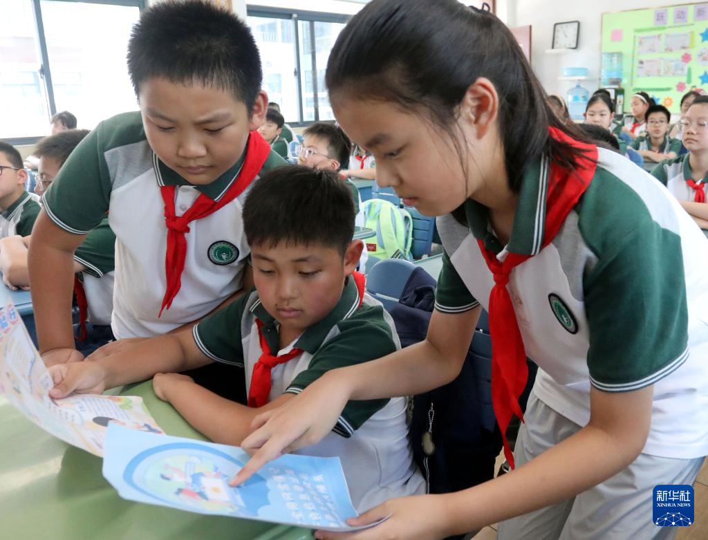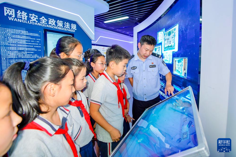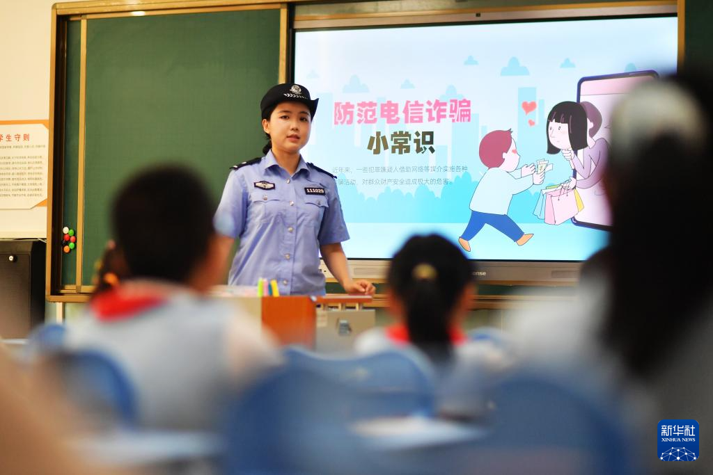 9月15日,在山东省青岛市市北区延安二路小学开展的网络安全教育主题活动上,民警为学生们讲解防范电信诈骗小常识。