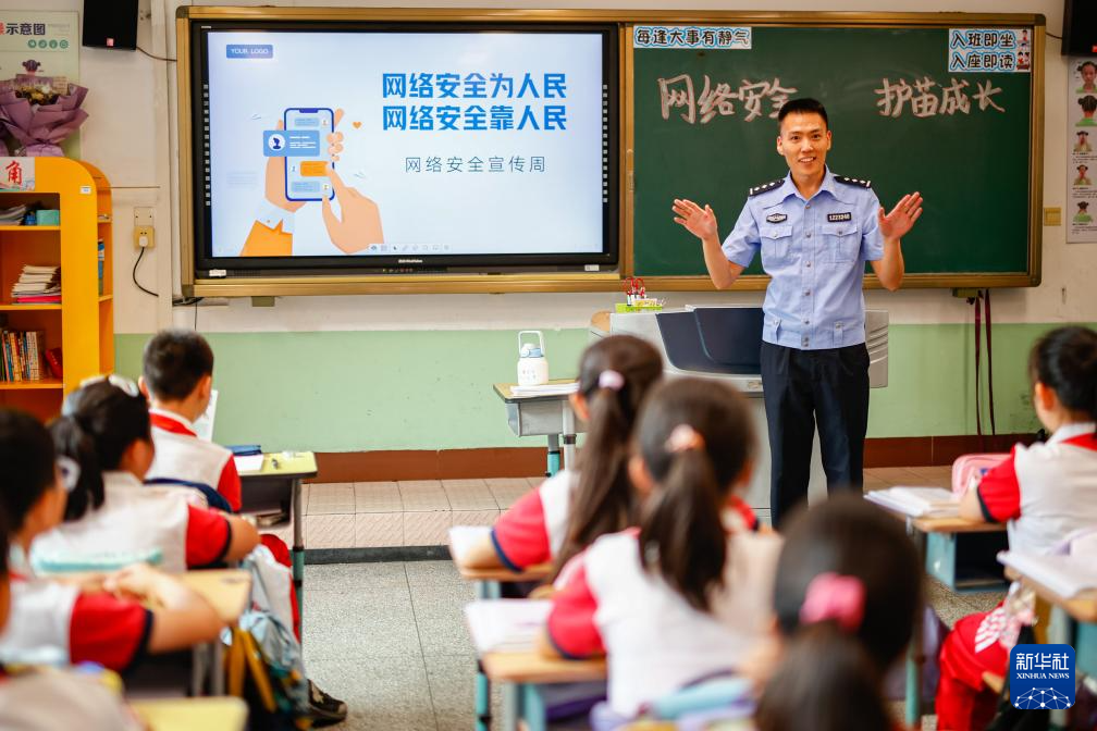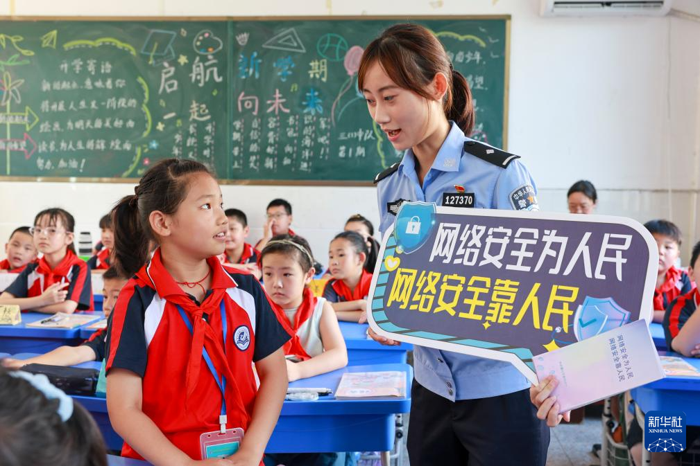 9月15日,在江苏省泰兴市襟江小学教育集团佳源校区,泰兴市公安局城北派出所民警通过互动方式在给学生讲解网络安全知识。
