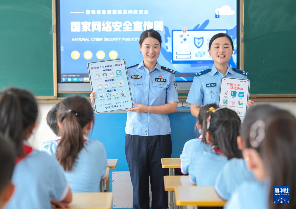 9月15日,在山东省荣成市府新小学教室内,辖区民警通过案例讲解为学生们普及网络安全和防诈骗知识。