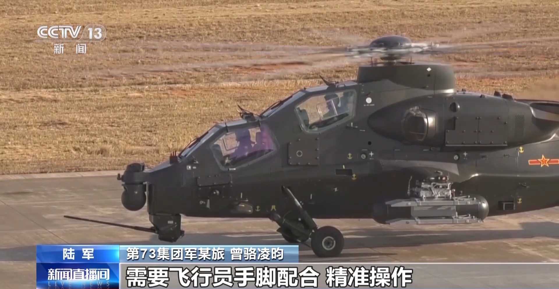 第73集团军某旅 曾骆凌昀:定点着陆时,由于地面风不停变化,越靠近地面影响越大,需要飞行员手脚配合、精准操作,同时对外观察精准判断,不断保持和修正状态,在30秒钟内完成着陆动作,且着陆动作最大误差不能超过20厘米,对飞行员的精准操作能力提出了很高的要求。