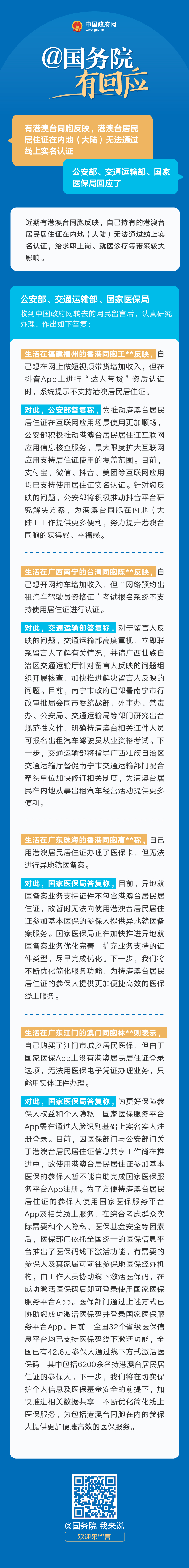 原标题:公安部、交通运输部、国家医保局答网民关于“加快推进港澳台居民居住证线上实名认证”的留言