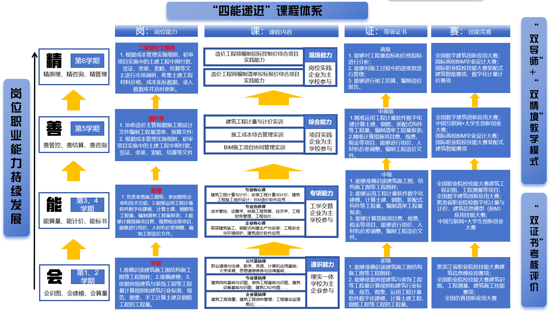 四阶递进育能,衔接职业晋升路径。构建“基础能力—专项能力—综合能力—现场能力”四阶课程体系,对接“学徒—助理—造价员—造价工程师”职业发展路径,融合“1+X”(工程造价数字化应用)初-中-高职业技能等级标准,按学年分阶段设置由简入繁、从单一到综合的知识技能模块,实现职业能力培养与岗位晋升路径的动态衔接。双轨并行施教,实现知识技能同构。以“编预算—做标书—全咨询”业务流程为脉络,开发核心课程体系,夯实专业知识架构;依托校企共建数字造价虚拟仿真中心,构建“岗位认知实践—业务流程模拟—综合项目实战”三阶递进式实训体系,借助 BIM 技术、虚拟施工等数字化手段,强化场景化实操能力。同时融入思政教育、人文素养、职业精神、身心素质“四位一体”价值引领模块,推动专业教学与德育教育深度融合。三标四维考评,赋能人才培养提质。以“数智融合”为驱动,对标黑龙江省数字化计量计价职业技能竞赛评分标准、“1+X”工程造价数字化应用职业技能等级证书认证标准,结合课程思政目标,制定专业技能、职业素养、思政表现 “三标”考核指标。整合岗位能力、教学考核、竞赛评价与企业认证要素,构建“四维”评价模式。依托数字化教学评价平台,实施校企双导师联合评分、动态跟踪学生成长轨迹,推动“岗课赛证” 融通,提升人才培养与行业数字化转型适配精度。