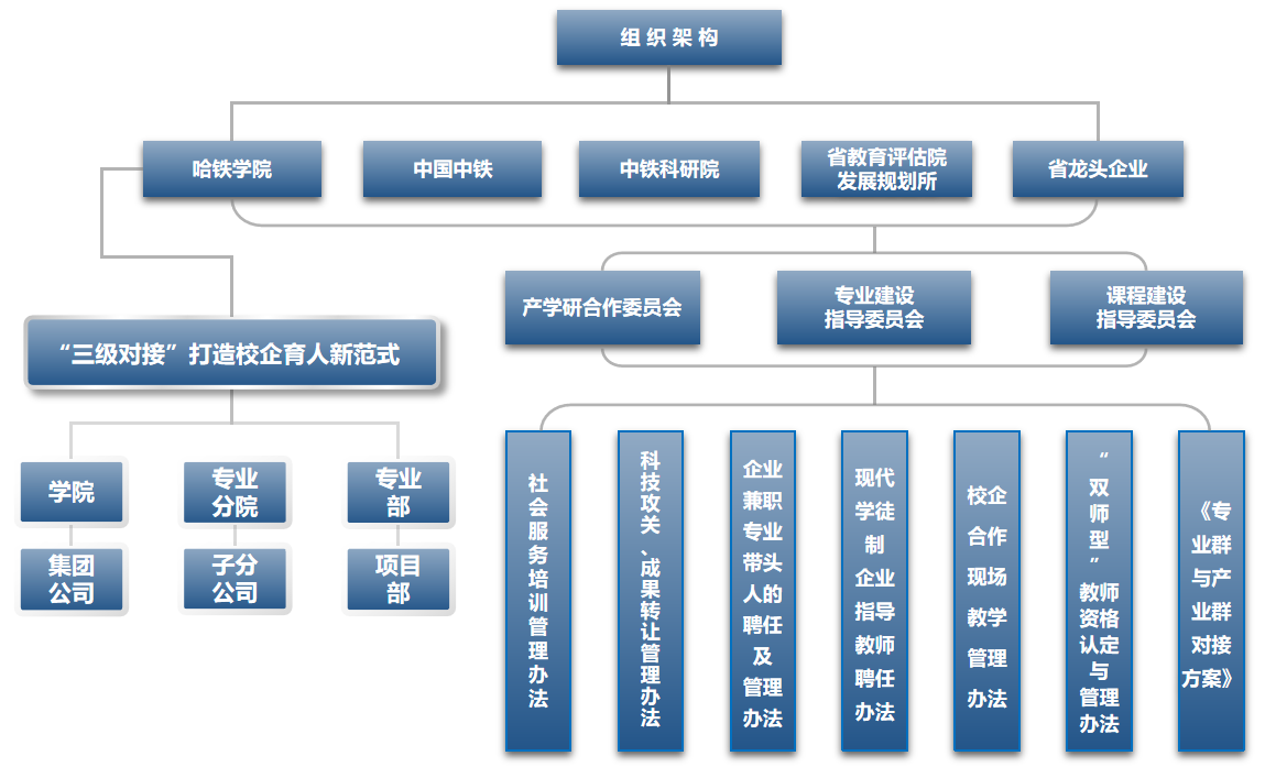 以“三共”为实体化基础,筑牢产教融合根基。以创新“金三角”合作运行机制为核心驱动力,聚焦工程造价专业领域,以数字建筑产业学院为实体载体,通过《校企合作融合发展协议书》的契约化约束,明确产、校、企三方权责利,构建资源共投、过程共管、成果共享的“三共”责任共担机制,夯实产教融合的实体化根基。以“三融”为制度性保障,完善产教融合体系。依托产学研合作委员会、专业建设指导委员会,构建“基础制度+专项制度”双轨制保障架构。通过《校企合作促进条例》等基础制度,全流程规范校企协同;制定《工程造价专业人才培养质量提升实施细则》等专项制度,精准对接行业需求,动态优化制度体系,推动校企组织架构协同重构与专业产业资源深度耦合,实现“三融”目标,为产教融合长效发展提供坚实制度支撑。以“三对接” 为实施路径,深化产教融合效能。依托中国中铁一体化办学优势,构建“学院-集团公司、分院-子分公司、专业部-项目部”三级精准对接模式,实现人才培养链与建筑产业链的无缝衔接。聚焦专业动态调整、模块化课程开发、双师型师资共育、BIM技术攻关等关键领域,创新建立“多方协同、利益共享、风险共担”的产学研协同育人长效机制,推动产教融合向专业化、高质量方向持续迈进。