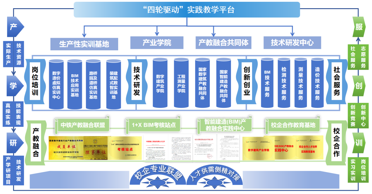 立足建筑行业数字化转型战略需求,以“产学研训创服”一体化为核心路径,系统构建“1+4+N+4”的“四轮驱动”实践教学平台,打造校企深度协同育人新生态。依托广联达科技等行业头部企业,共建数字建筑产业学院,同步建成BIM技术应用、智能建造、数字造价、项目管理4个生产性实训基地,实现建筑工程设计、施工、造价等全生命周期管理流程的1:1场景还原。联合黑龙江省工程造价咨询协会、广联达等企业,加入数字建筑、智能建造等 N个产教融合共同体,联合共建BIM技术研发中心、数字造价研究中心等4个技术研发平台,形成“教学实践-技能提升-技术创新-产业反哺”的闭环运行机制。以建筑工程全生命周期业务链为主线,将工程识图、材料试验、施工技术、计量等核心技能深度融入平台建设。校企联合开发12门在线课程(其中国家在线开放课程1门、省级精品课程5门),共建包含300+企业真实案例的教学资源库。推动实践教学从单一校企合作实训基地向集教学实施、岗位培训、技术研发、社会服务于一体的综合产教融合平台升级,年均开展岗位培训1000+人次,技术服务年到款额显著提升,为建筑行业数字化转型提供坚实的人才与技术支撑。