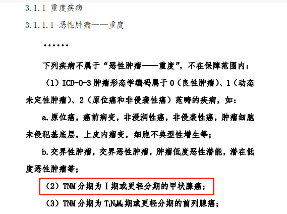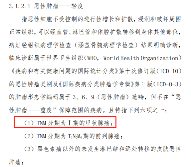 现行的《重大疾病保险的疾病定义使用规范(2020 年修订版)》中,引入轻度疾病定义,将恶性肿瘤、急性心肌梗死、脑中风后遗症3种核心疾病,按照严重程度分为重度疾病和轻度疾病两级。TNM分期(肿瘤学中对肿瘤的一种分期形式。T是原发灶、N是淋巴结、M是远处转移)为Ⅰ期或更轻分期的甲状腺癌不列入“恶性肿瘤——重度”的保障范畴。另外,WHO将部分“包裹型滤泡型甲状腺乳头状癌”命名为“带乳头状细胞核特征的非侵袭性滤泡型甲状腺肿瘤”,名称中不再带有“癌”。以上原因,让部分网友误认为甲状腺癌已经不再是“癌症”了。
