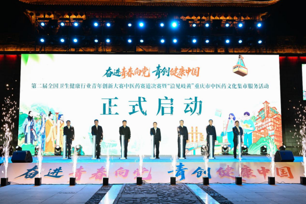 启动仪式上,随着嘉宾们共同按下启动按钮,10根能量柱同步点亮,第二届全国卫生健康行业青年创新大赛中医药赛道决赛暨“渝见岐黄”中医药文化集市服务活动正式启动。