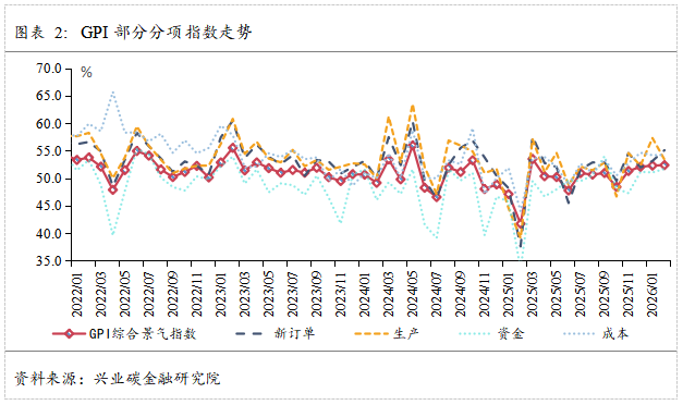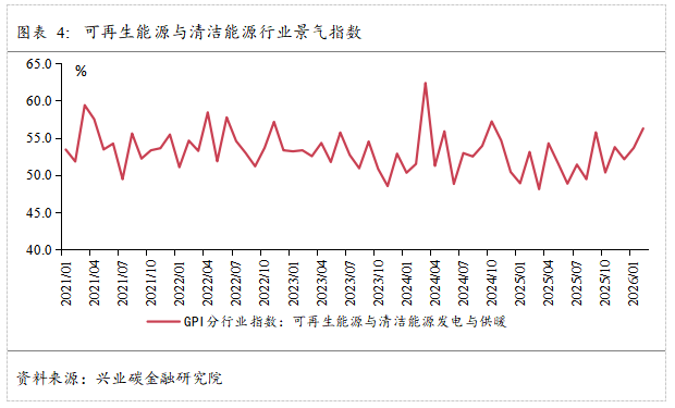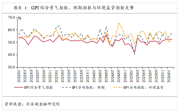 2月调研数据显示,2026年2月GPI指数为52.4%,环比微升0.1个百分点,连续处于扩张区间。与此同时,2月预期指数环比上升3.6个百分点,边际有所改善,市场对绿色产业发展信心持续增强。