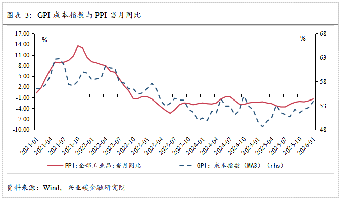从分项指数来看,需求方面,2月新订单指数环比回升2.0个百分点,出口指数亦同步增长2.7个百分点,绿色产业内需外需协同增强。供给方面,受春节假期扰动,2月生产指数呈现季节性回落,环比下降3.9个百分点,扩张放缓。资金周转方面,2月资金指数环比微升0.7个百分点,绿色企业资金周转情况保持平稳。成本方面,本月成本指数仅小幅上行0.1个百分点,成本压力整体可控,同时近期成本指数走向与PPI当月同比走势保持较高一致性。