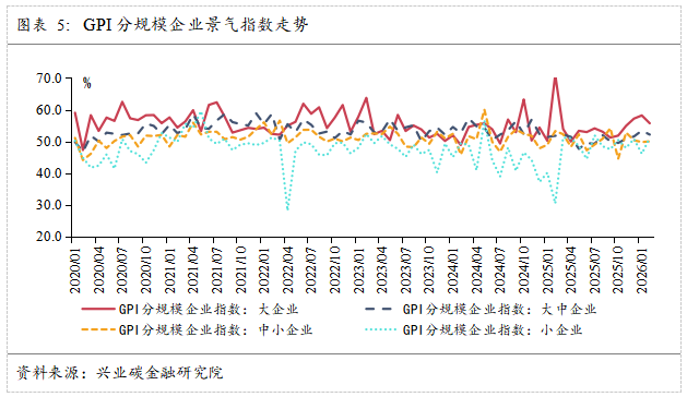 分企业规模来看,2月GPI调研数据显示,小型绿色环保企业景气指数回升明显,环比上升5.0个百分点,达到51.1%,重新站上荣枯线;中小型企业景气指数也环比微增0.2%,同样回升至临界点以上。相比之下,大型及大中型绿色环保企业景气指数则有所回落,分别较上月下降2.5和1.2个百分点,扩张步伐有所放缓,整体仍展现出较强的发展韧性。(兴业研究 徐金、方琦、钱立华)